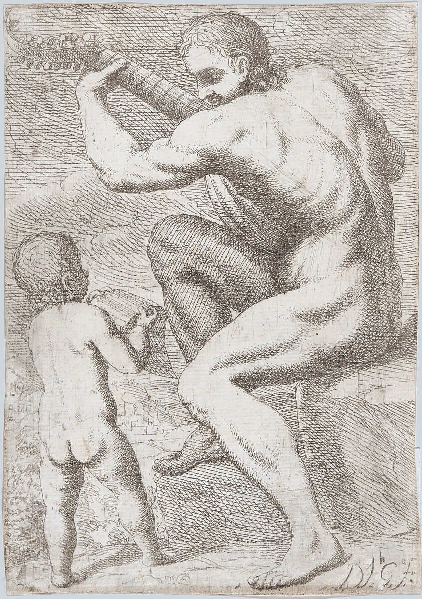 - Title: Study of a naked man playing a vihuela, a child holding a sheet of music at the left, from "Principios para estudiar el Nobilísimo y Real arte de la Pintura"