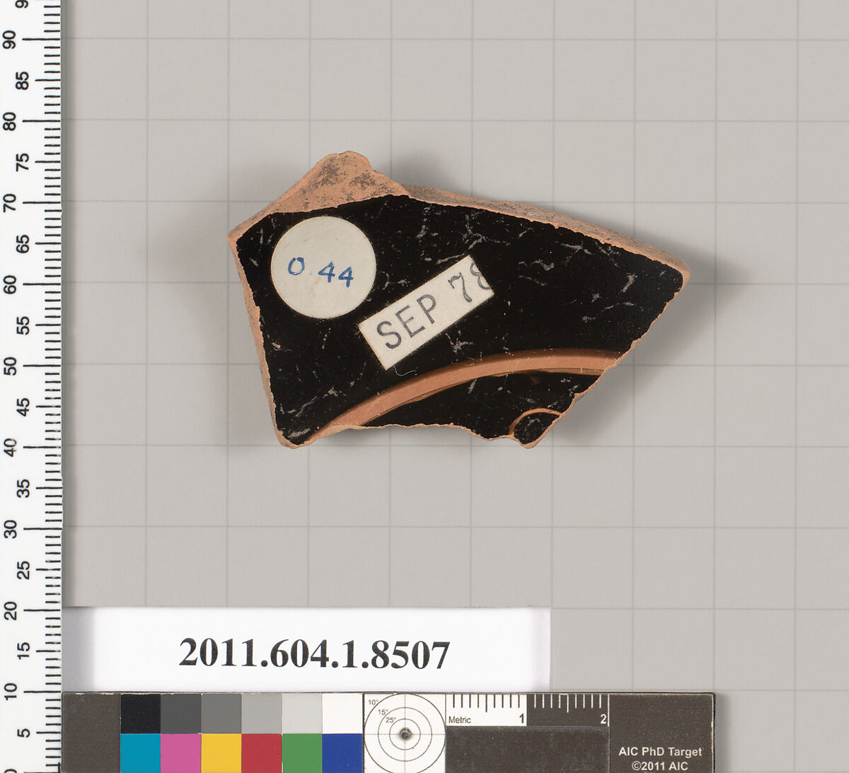 - Title:Terracotta fragment of a stemless kylix (drinking cup)