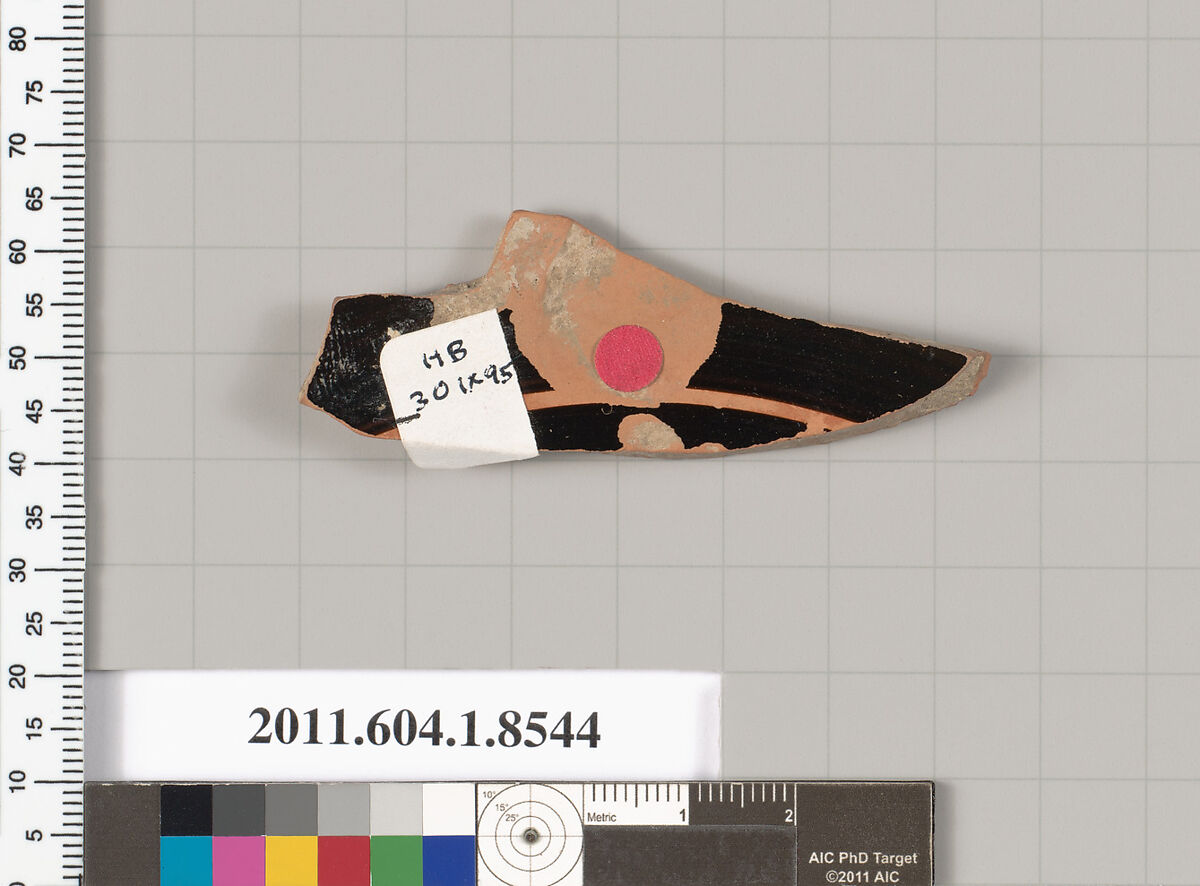 - Title:Terracotta fragment of a stemless kylix (drinking cup)