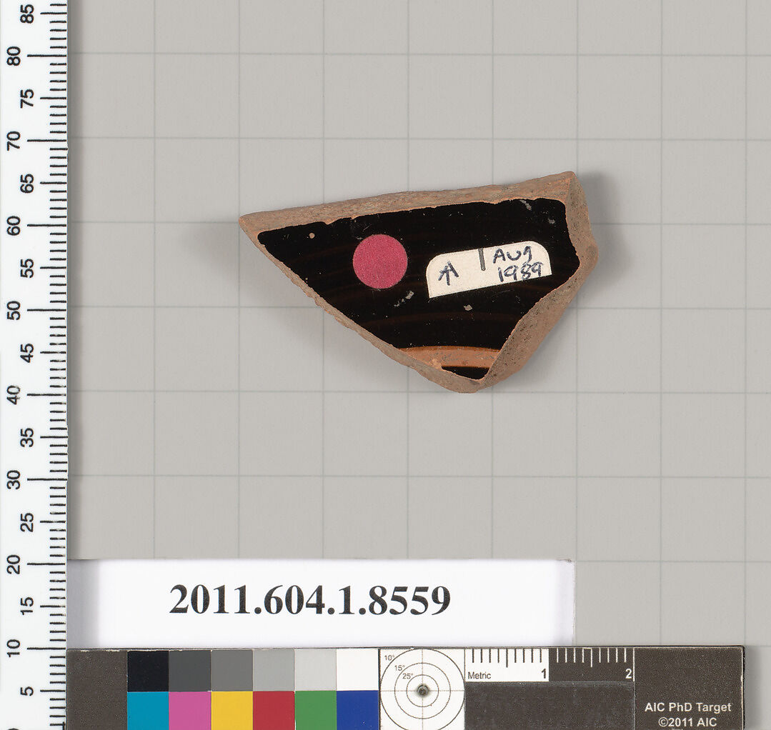 - Title:Terracotta fragment of a stemless kylix (drinking cup)