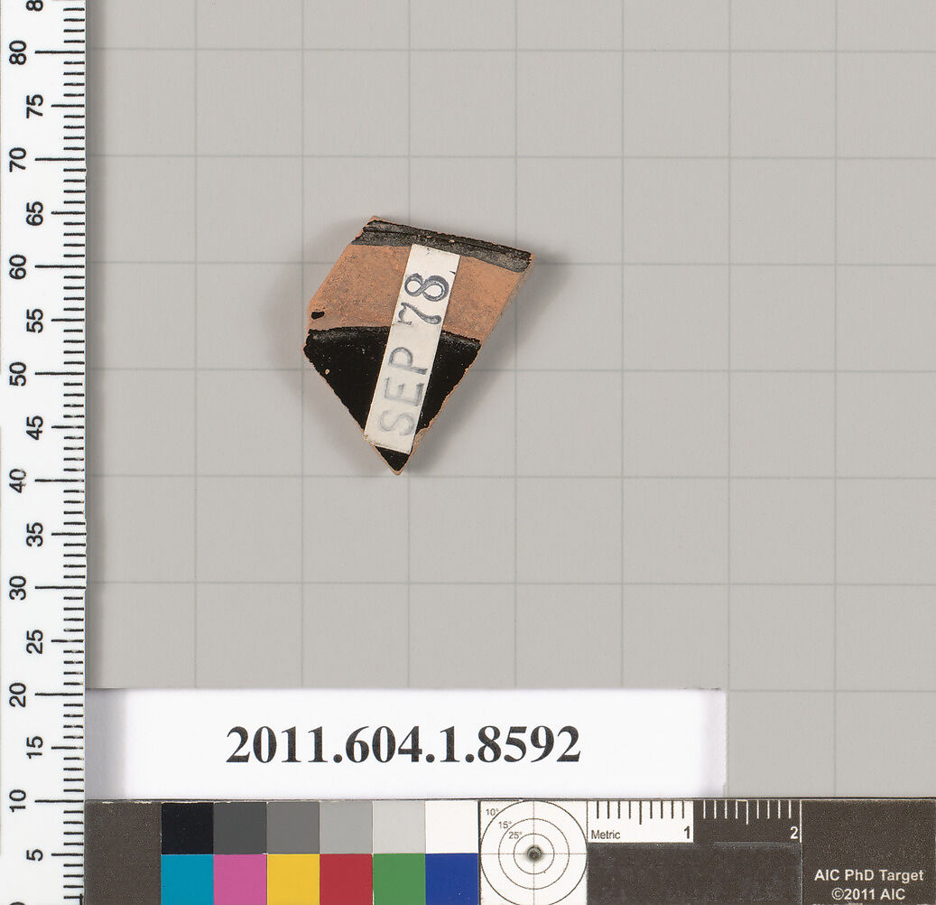 - Title:Terracotta fragment of a stemless kylix (drinking cup)
