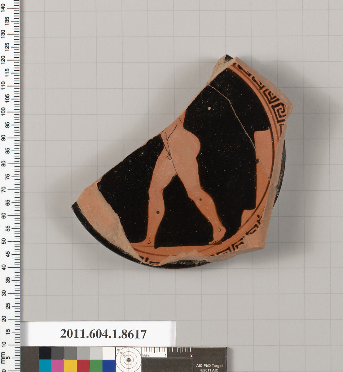 Interior, on exergue, part of lower torso, genitals, left buttock, and legs of a youth to left; behind the youth, a goal post; Exterior, profiled ring foot, the resting surface is unglazed, and the inner wall of the foot is glazed; the underside of the floor is decorated with concentric circles; the outermost edge is in reserve, followed by a wide band of black glaze; a thin band of reserve, and a thin band of black glaze frames a reserved circle in the center which has a small black glaze circle in the middle with a dot in the center