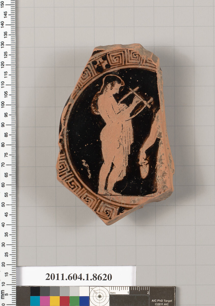 Interior, on exergue, nude youth to right with a himation draped around his left arm, holding a lyre in his hand; right arm, and leg of a figure, with the right hand holding an oinochoe; Exterior, profiled ring foot; resting surface is unglazed; the inner wall is glazed; the underside of the floor is decorated in concentric circles; the outer most edge is in reserve, followed by a thin band of black glaze, and another band of reserve; a thin black glaze borders the center which is in reserve; an inner band towards the center is concave and bordered by chamfered edges; one letter of a graffito, A