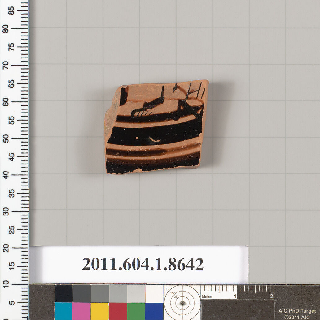 - Title:Terracotta fragment of a stemless kylix (drinking cup)