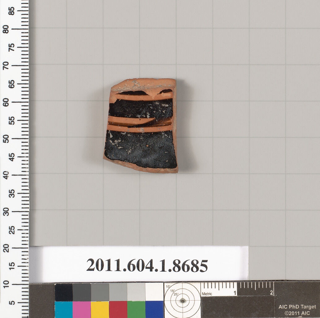 - Title:Terracotta fragment of a stemless kylix (drinking cup)