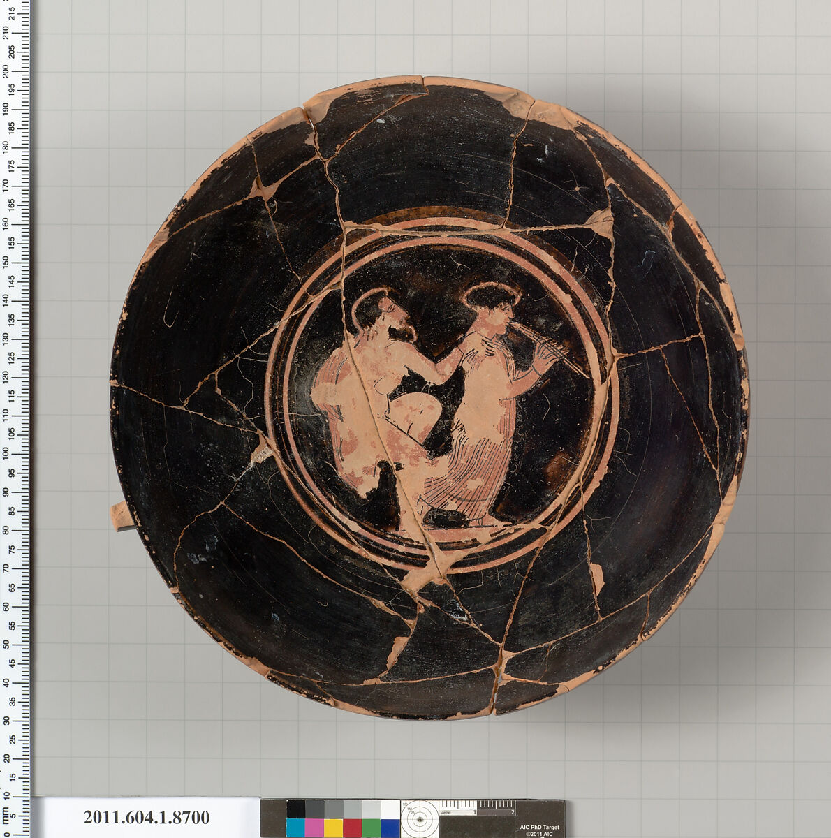 Interior, on exergue; bearded man with his himation draped down his back, approaching a woman from behind, with his right hand resting on her right shoulder; the woman wears a chiton and plays the aulos; Exterior, both the obverse and reverse are decorated with a lozenge pattern; each glazed and reserved lozenge has a dot drawn in black glaze; under each handle, in silhouette, a quadruped to right