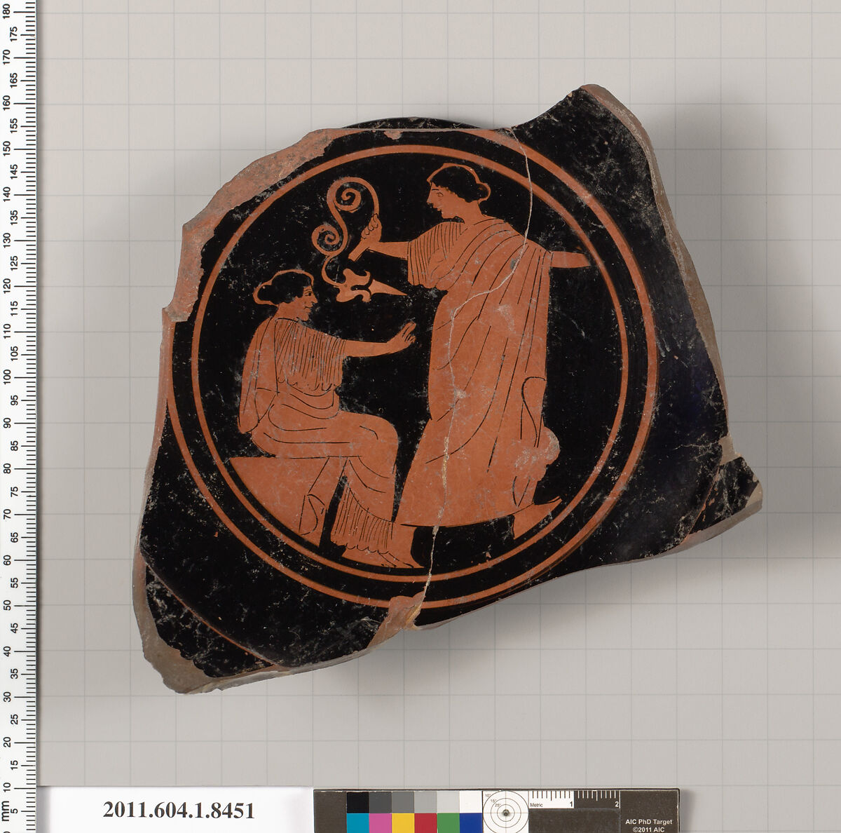 - Title:Terracotta fragment of a stemless kylix (drinking cup)