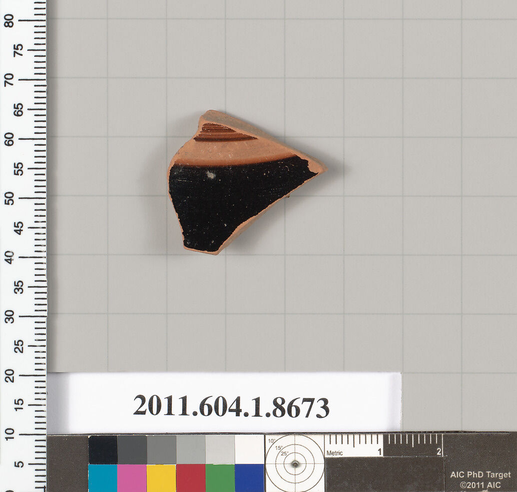 - Title:Terracotta fragment of a stemless kylix (drinking cup)