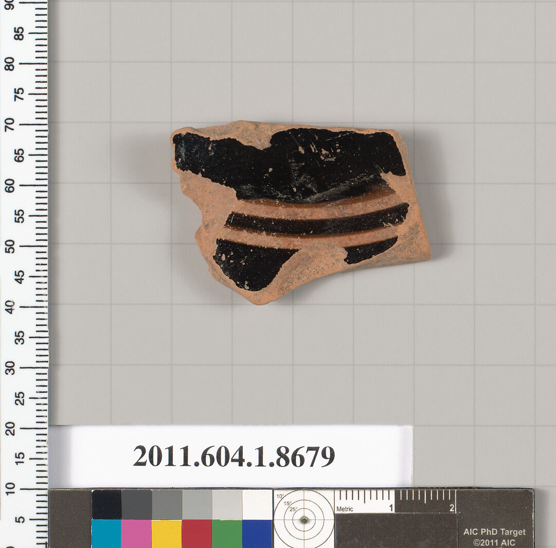- Title:Terracotta fragment of a stemless kylix (drinking cup)