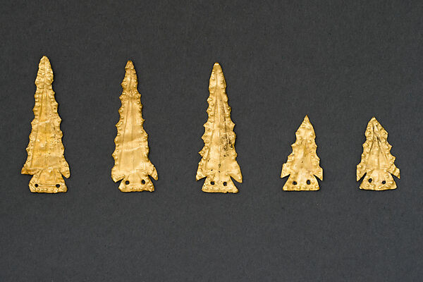 Estas cinco lentejuelas tienen forma de puntas de flecha. Las lanzas de piedra o puntas de dardos eran las armas supremas de los cazadores y de los guerreros en la antigua Mesoamérica, y sus imitaciones de oro sugieren que estos adornos simbolizaban la habilidad en estas disciplinas.