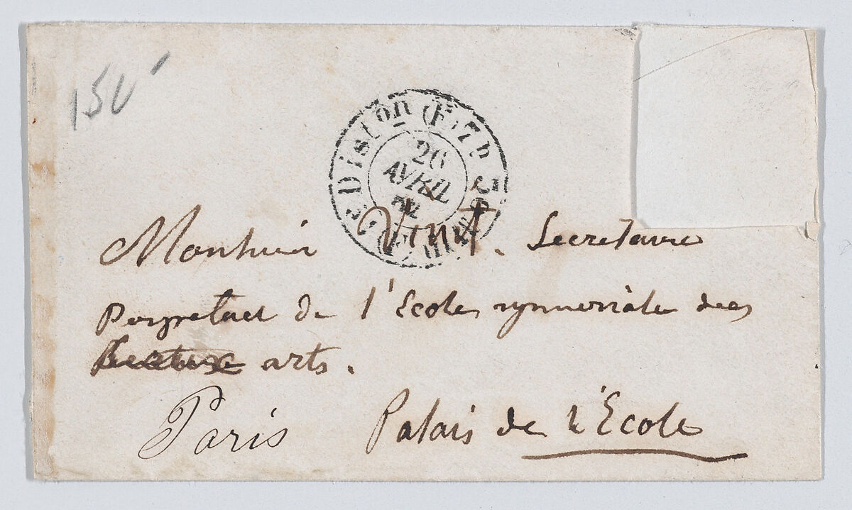 F. C. Schang donated 64 artists’ calling cards to The Met between 1977 and 1989. The calling cards are housed in an album that also includes Schang’s collection of stamps and other related ephemera. Calling cards derived from a custom, originating in England, in which messages were inscribed on the backs of playing cards. Cards made for the express purpose of sharing hand-written messages were manufactured beginning in the eighteenth century; by the early-nineteenth century, calling cards had become a popular means for sending well wishes, holiday greetings, condolences, and messages of courtship.
