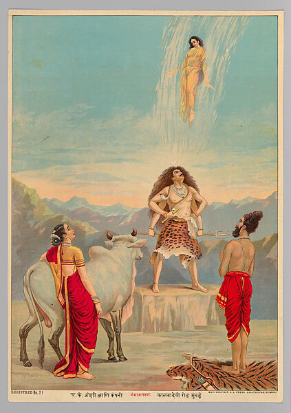 This scene depicts the Hindu god Shiva’s role in one of the great origination myths of ancient India, the origins of the ancient river Ganges, who descended to earth from the Himalayas in a great deluge. The ascetic sage Bhagiratha, seen standing on a tiger’s skin, his hands clasped in in veneration, has through yogic practices and austerities compelled Shiva to grant him the boon of bringing the celestial river Ganges down from heaven to earth. Ganga is here shown in the form of a youthful goddess enveloped in a cascade of water descending from the sky. Bhagiratha petitioned Shiva to bring the Ganges to earth in order to consecrate and purify the cremated ashes of his ancestors and to alleviate a worldwide drought. As the mighty descent of this river threatened to destroy the earth, Shiva, who was meditating on Mount Kailash high in the Himalayas, broke its fall by catching the river in his hair (a moment routinely depicted in Chola bronzes of Shiva Nataraja). In this print, Shiva braces himself against the impact of the descending Ganga while his consort, Parvati, uneasy at the arrival of a beautiful rival, leans nonchalantly on Shiva’s bull, as the waters begin to spill across the earth.