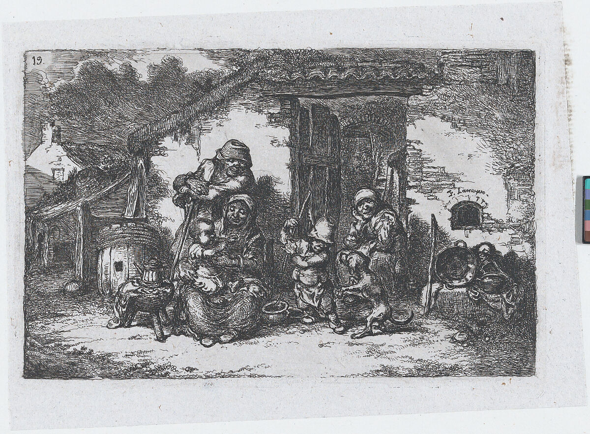 - Title: Plate 19: a family and a boy playing with a dog outside a house, from "Customs and Pastimes of the Spanish People"