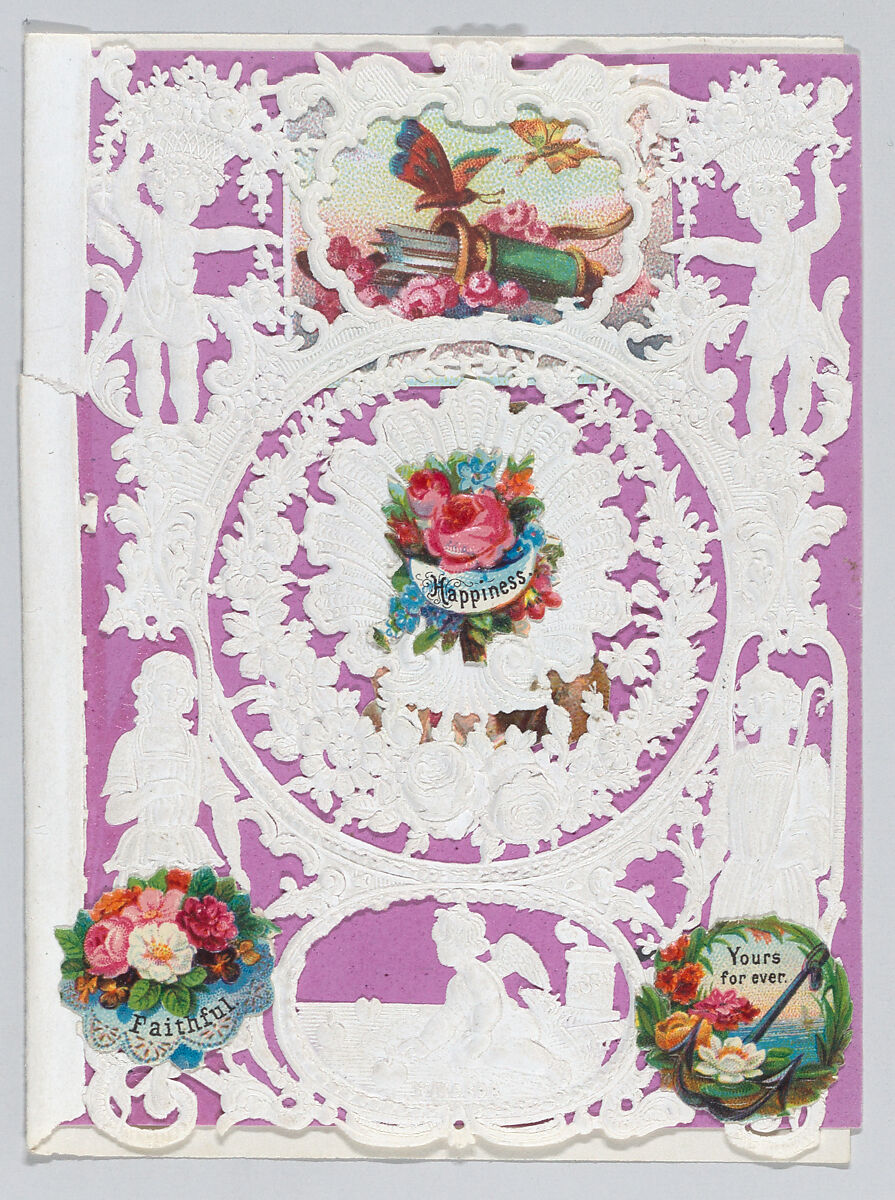 - Medium:Cameo-embossed open-work lace paper, chromolithography, colored paper
