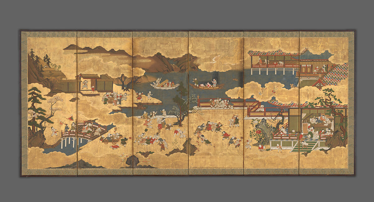 A sumptuous estate, including a bridge and pavilion over a lake, is set off by a shimmering gilded background and golden clouds and enlivened by cavorting children. The conventional motif of One Hundred Children has obvious auspicious connotations in the Chinese tradition. Here, the ancient subject is combined with the moralizing theme of the Four Gentlemanly Accomplishments (calligraphy, painting, music, and the game of go), which engage the children. One Hundred Children became one of the most popular themes among the Kano painters, the official artists who worked for the shoguns and their vassals during the Edo period. The anonymous painter of this screen seems to have based it on a readily available model. The dry, mannered execution of the landscape elements points to a date in the eighteenth century for this work.
