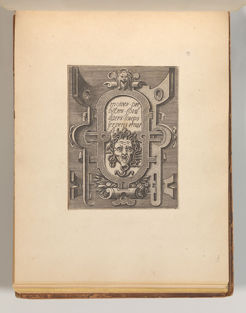 This album contains several print series with designs for strapwork cartouches. The first half of the album consists of plates from the series "Targhe ed altri ornate d varie e cappriciose invenzione (…)", published in Rome by Carlo Losi in 1773. The series is made up out of Italian copies in reverse after several print series originally published in Antwerp in the sixteenth century. The Italian copies were likely made soon after, likely in the context of Antonio Lafreri’s publishing ventures in Rome. Losi obtained the old plates combined them into one series of twenty-five prints. The title plate and following eleven prints are copied after the series "Veelderhande cierlijcke Compertimenten (…)", designed by Jacob Floris and published by Hans Liefrinck in 1564. These are followed by copies in reverse (with some alterations) after Hans Vredeman de Vries’ series "Variarum Protractionum", first published by Gerard de Jode in 1555. Most, but not all of these plates, are accompanied by a second impression of the same print on the facing page. These are darker in tone, and pasted onto a thicker sheet of paper, rather than printed directly onto the album page. They may derive from an earlier edition of the Italian series, although they do not contain inscriptions that refer to Lafreri or Iacomo Marucci who are known to have owned the plates before Losi. In one case, Losi’s plate is combined with a copy in reverse in a less accomplished hand. The second half of the album consists of a series of smaller prints containing strapwork cartouches with masks and short inscriptions in French, often attributed to Cornelis Bos. However, two versions of this series were produced during the sixteenth century: one with the cartouches on a blank ground, and one with the images in reverse and presented on a hatched ground. The latter versions is the one included in this album, which is further distinguished by the fact that it features landscapes instead of inscriptions in those cases where the compartment was filled with a text alone. This feature is reminiscent of various prints of the so-called School of Fontainebleau. One outlier is formed by a cartouche with and alphabet in majuscules. The design of the cartouche is close to those designed by the enigmatic artists Benedetto Battini for Hieronymus Cock’s 1553 series of strapwork cartouches with quotations in Latin, but it is not a copy. This print is signed with the initials of the French artist Georges Reverdy, which has previously led to the idea that Reverdy might be the artist responsible for the entire series of cartouches on a hatched ground. The difference in the execution of the prints speaks against this hypothesis, however.