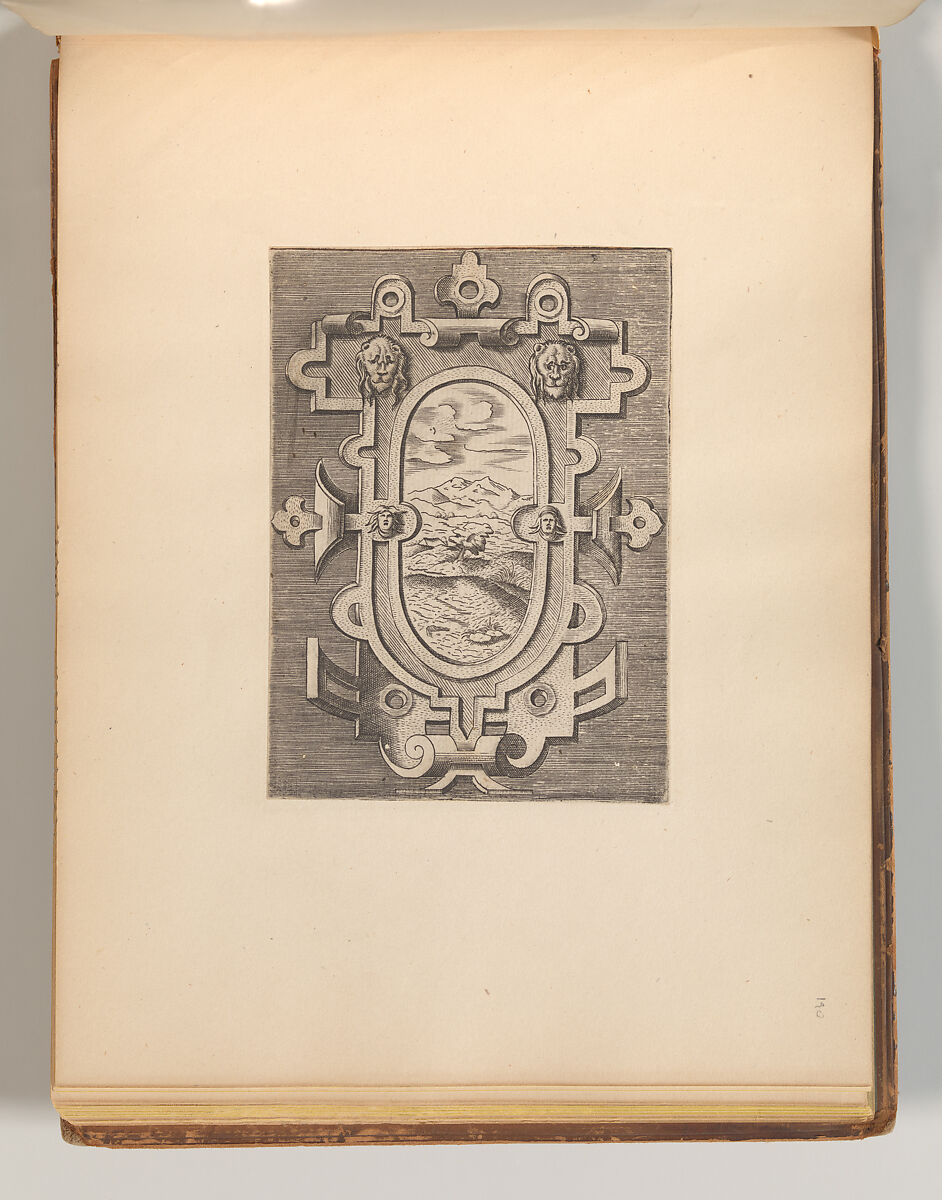 This album contains several print series with designs for strapwork cartouches. The first half of the album consists of plates from the series "Targhe ed altri ornate d varie e cappriciose invenzione (…)", published in Rome by Carlo Losi in 1773. The series is made up out of Italian copies in reverse after several print series originally published in Antwerp in the sixteenth century. The Italian copies were likely made soon after, likely in the context of Antonio Lafreri’s publishing ventures in Rome. Losi obtained the old plates combined them into one series of twenty-five prints. The title plate and following eleven prints are copied after the series "Veelderhande cierlijcke Compertimenten (…)", designed by Jacob Floris and published by Hans Liefrinck in 1564. These are followed by copies in reverse (with some alterations) after Hans Vredeman de Vries’ series "Variarum Protractionum", first published by Gerard de Jode in 1555. Most, but not all of these plates, are accompanied by a second impression of the same print on the facing page. These are darker in tone, and pasted onto a thicker sheet of paper, rather than printed directly onto the album page. They may derive from an earlier edition of the Italian series, although they do not contain inscriptions that refer to Lafreri or Iacomo Marucci who are known to have owned the plates before Losi. In one case, Losi’s plate is combined with a copy in reverse in a less accomplished hand. The second half of the album consists of a series of smaller prints containing strapwork cartouches with masks and short inscriptions in French, often attributed to Cornelis Bos. However, two versions of this series were produced during the sixteenth century: one with the cartouches on a blank ground, and one with the images in reverse and presented on a hatched ground. The latter versions is the one included in this album, which is further distinguished by the fact that it features landscapes instead of inscriptions in those cases where the compartment was filled with a text alone. This feature is reminiscent of various prints of the so-called School of Fontainebleau. One outlier is formed by a cartouche with and alphabet in majuscules. The design of the cartouche is close to those designed by the enigmatic artists Benedetto Battini for Hieronymus Cock’s 1553 series of strapwork cartouches with quotations in Latin, but it is not a copy. This print is signed with the initials of the French artist Georges Reverdy, which has previously led to the idea that Reverdy might be the artist responsible for the entire series of cartouches on a hatched ground. The difference in the execution of the prints speaks against this hypothesis, however.