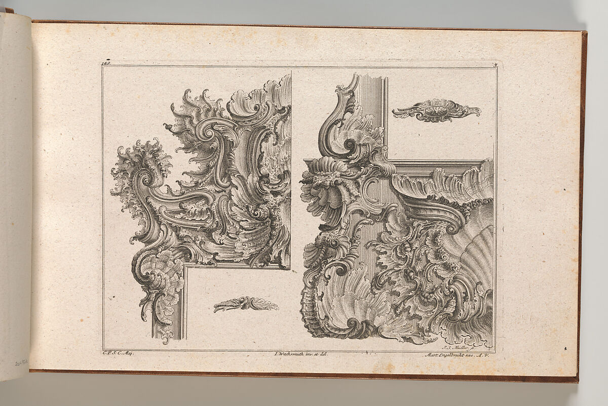 Ornament print with two designs for the decorations of frames: on the left the top of a rectangular frame; on the right the bottom of a window or mirror frame. This print is bound in an album containing 27 series with a total of 122 ornament prints from the fund of the prominent Augsburg publisher Martin Engelbrecht.
