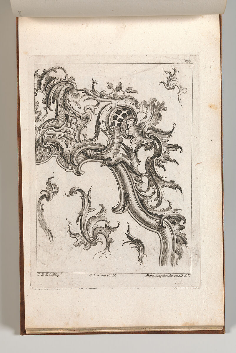 Ornament print with designs for rocaille ornaments, including one large ornament forming the top right corner of a frame or arch and four loose rocailles. This print is bound in an album containing 27 series with a total of 122 ornament prints from the fund of the prominent Augsburg publisher Martin Engelbrecht.