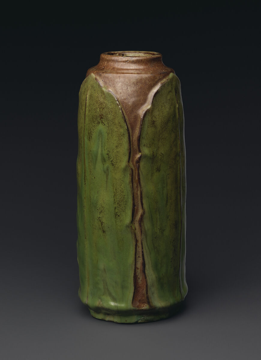 William J. Walley was one of Grueby’s many followers in the Northeast. Working in his small pottery in West Sterling, Massachusetts, and inspired by Grueby’s leaf-based designs, Walley turned from historicizing shapes to vessels with richly modeled plant forms that are variations on Grueby’s inventions. Whereas the Boston pottery relied on decorators to apply thin ropes of clay to delineate the leaves, in many instances Walley created designs where the leaves are modeled with greater relief.
