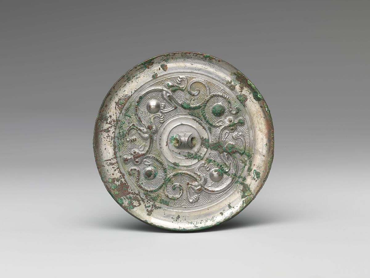 Each of the spirited dragons depicted on the back of this bronze mirror has a slender, sinuous body and a long, ribbed horn. The pair writhe amid waves that swirl around a central boss; four hemispherical knobs may allude to the immortal isles of ancient Chinese cosmology.