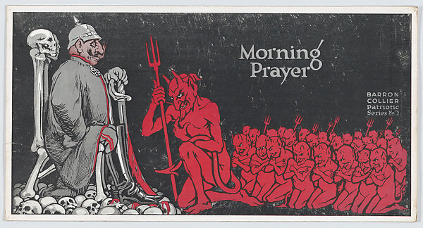 Propaganda poster showing devils kneeling in prayer before Kaiser Wilhelm II. This idea that the Kaiser was a figurative devil was a popular theme in American, British, and French propaganda.