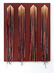 Regina Bogat matured as an artist in New York City in the 1960s, where she travelled in circles that included Abstract Expressionists, Minimalists, and Post-Minimalists. A hybrid object, Cord Painting 15 is a tall rectangular canvas onto whose rust-colored surface the artist has painted in beige four equally-sized and equally-spaced arrow-shaped forms. Through the top of these forms Bogat threaded pieces of nylon rope in a range of hues—mostly muted browns and pinks with the occasional black and white—tying them in the back and securing the knots with tape. The cords are arranged by color and separated by regular intervals. When seen from the back, the knots form a row of grids. This order quickly descends into chaos, however, when the cords fall towards the floor, creating a tangled, multi-chromatic mess that disrupts the stability and purity of the grid format.