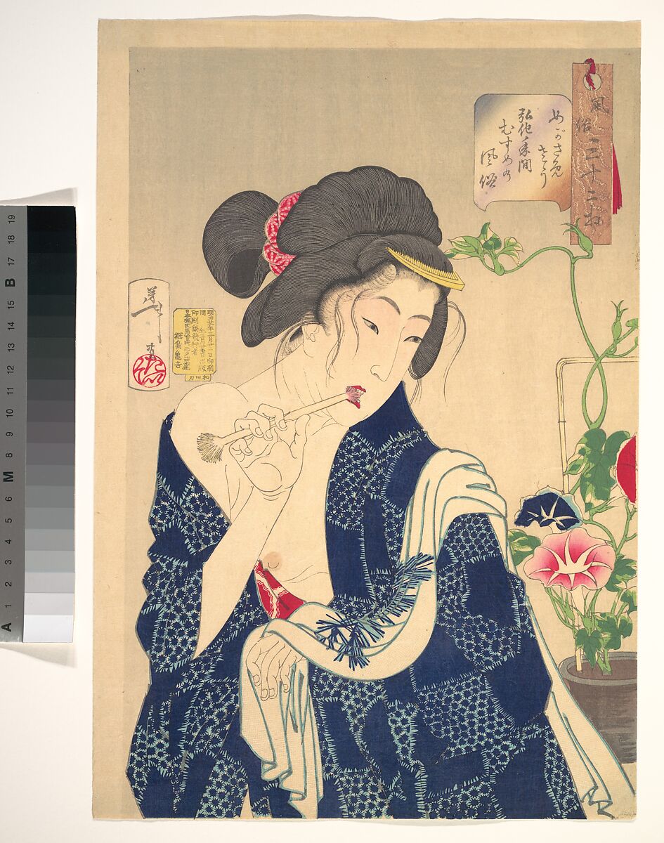 The series that made Yoshitoshi a noted artist was one of the most important Meiji series of ukiyo-e prints of beauties. The lady cleans her teeth with a split-bamboo toothbrush. Her cotton sleeping robe slips off one shoulder, and a few strands of her hair have come loose, suggesting that she is only half awake. The large morning-glory flowers, known as asagao (literally, "morning faces"), in the pot behind her on the right, are cleverly associated with the portrait.