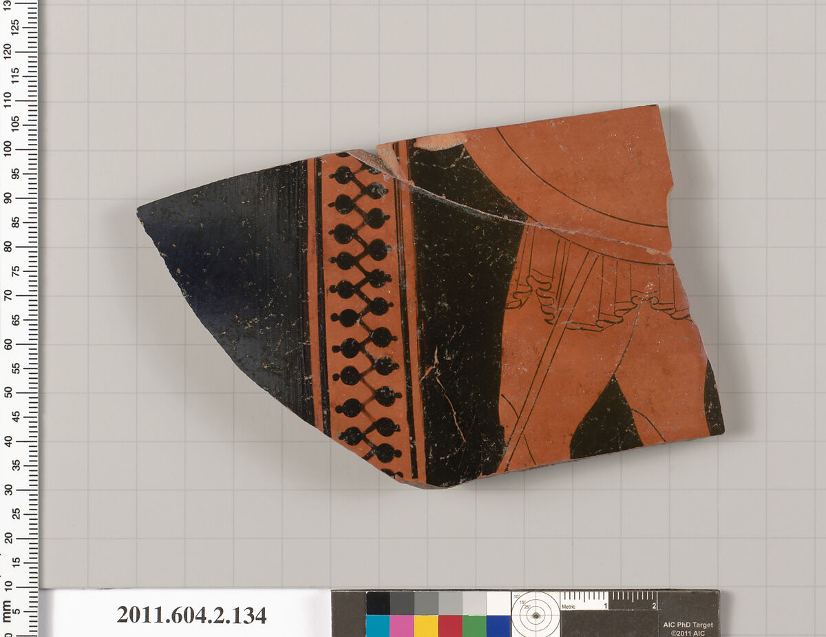 Part the lower torso and legs of a warrior to left, wearing a chitoniskos, with a round shield and spear; at the left, part of the panel ornament of a pelike: chain of pomegranates