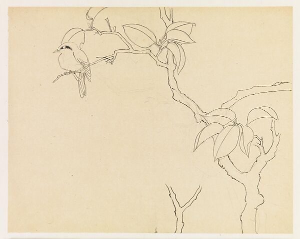 In this sheet, we see how Xie freely manipulated various motifs to create new compositions. The twig upon which the bird is perched adjoins a vertical branch. The cluster of leaves at lower right has been carried over from the preceding image but has been simplified and rotated ninety degrees clockwise.