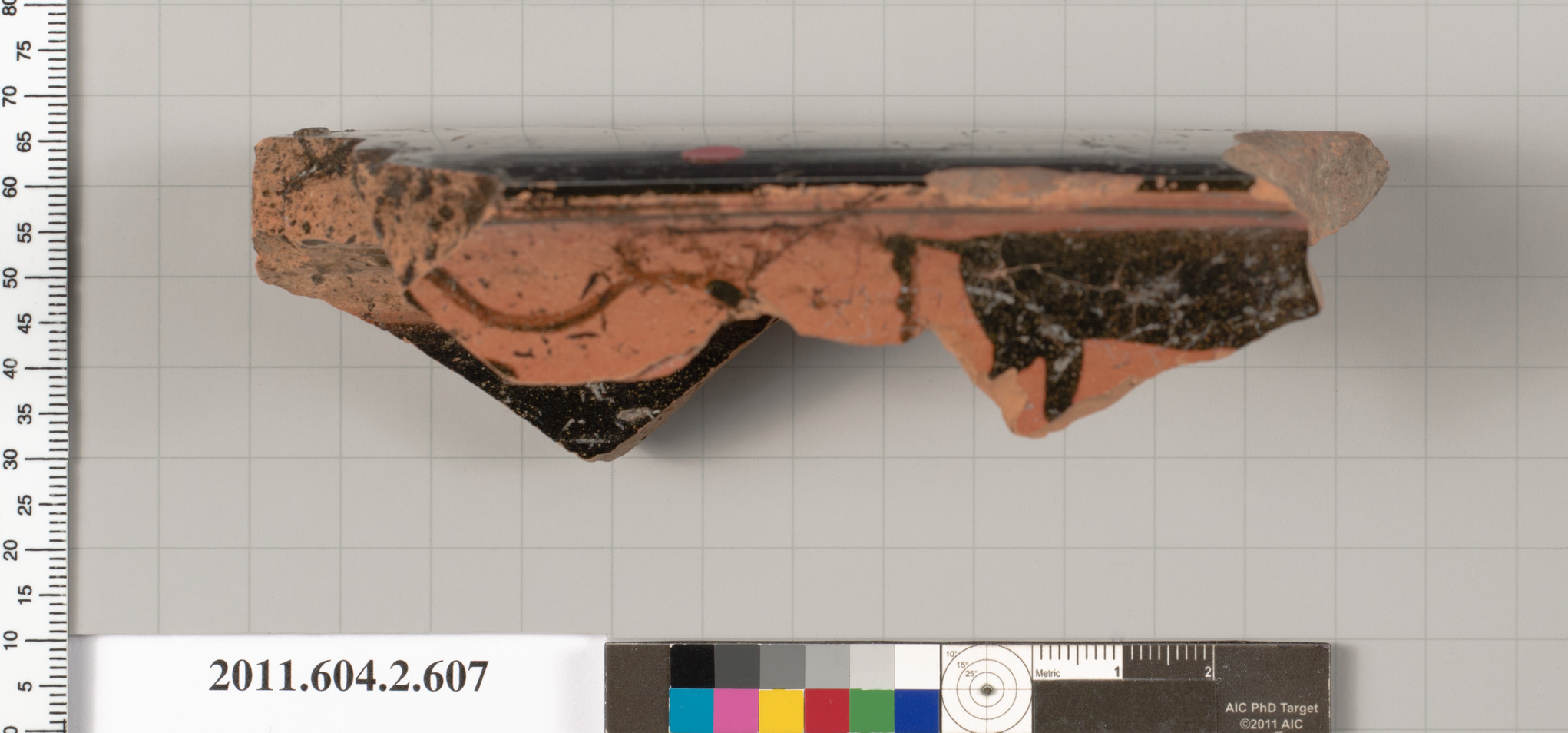On the side of the rim, an animal frieze, in silhouette, tail of an animal to left; part of a second animal (bull?), to right