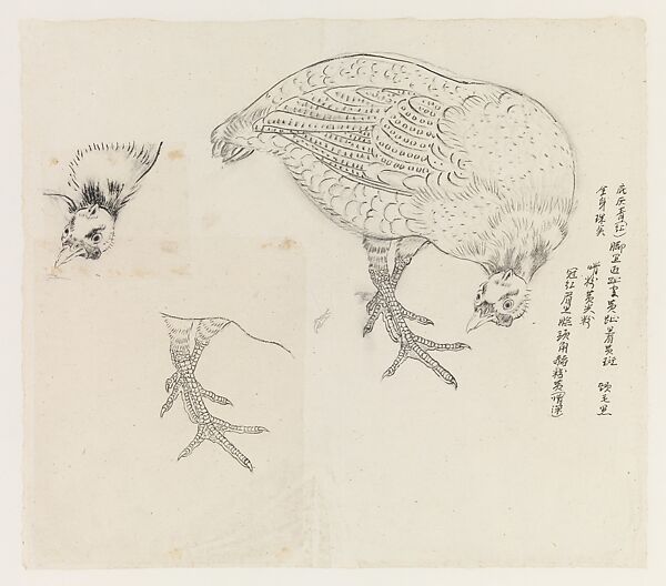 Xie often redrew anatomical details that demanded the greatest attention to accuracy. Here, in an accompanying inscription, he wrote detailed notes on the colors of various parts of the bird's body, such as black feet with pale yellow toes, black neck feathers, a powdery-yellow beak, a red crest, and black brows.