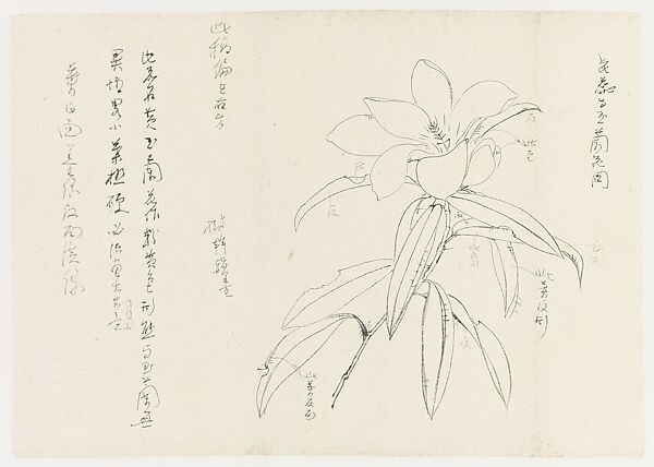 This sketch appears to have been based on another sketch drawn from life. Xie's accompanying notes identify the flower as a "yellow magnolia" (Michelia champaca) and meticulously describe the plant's coloring and other physical features.