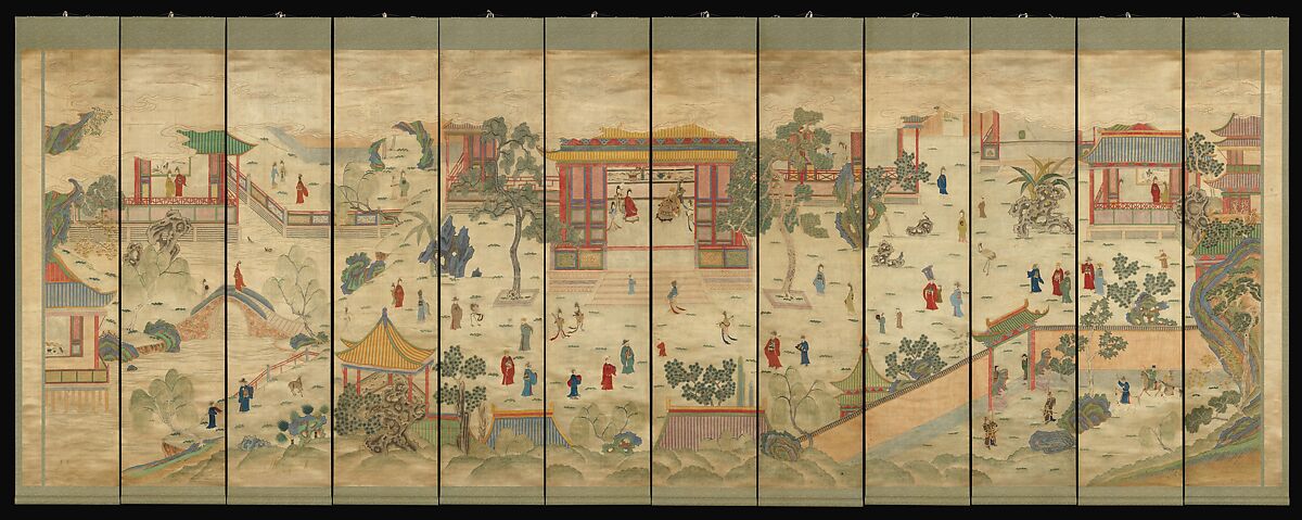 - Medium: Set of 12 hanging scrolls; silk embroidery and paint on silk satin