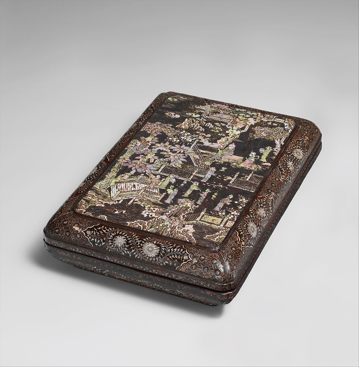 Three Chinese characters incised on a rectangular piece of shell at upper right identify the scene on this box as the “peach-blossom grotto” (tao yuan dong). The phrase refers to a famous poem by Tao Qian (365–427) in which a fisherman enters a grotto and stumbles upon Shangri-la. As is invariably the case with such magical realms, once the man leaves the cave he is never able to return.
