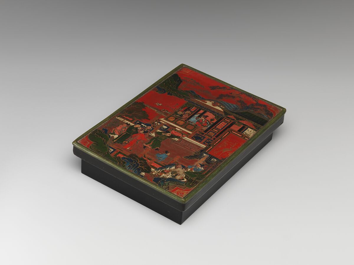 The scene on the lid represents the moment in ancient Chinese history when Li Yuan captured the hand of Princess Dou by shooting two arrows, each of which penetrated the eye of a peacock. Painted in brilliant shades of red, blue, and green, the rural scene shows Li Yuan shooting at a peacock depicted on a screen while the princess and her attendants watch from the safety of a pavilion. Li Yuan later became Emperor Gaozu (r. 618–26) of the Tang dynasty (618–906), and the theme is an important one in Ming-period decorative arts.