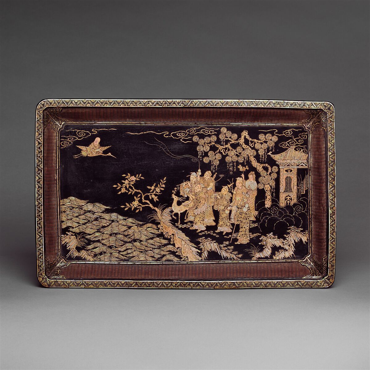 The eight figures assembled on the riverbank represent the Eight Immortals, a group of Daoist deities who originated from the legends of the Tang dynasty (618–907). They can each be identified by their personal attributes, including the flute, staff, sword, flower, and gourd. Here, they await the arrival of Shoulao, God of Longevity, who is flying above the waves on the back of a crane. Daoism gained increasing popularity in the sixteenth and seventeenth centuries, and so did its imagery. This exquisitely decorated tray is a remarkable example.