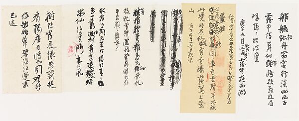 Xie often mounted related poems together, even when they were written on different sheets of paper; in this instance, four poems appear on three sheets. When Xie mounted them onto a larger sheet, he added a fifth poem, dated September 1990, at right. The adjacent poem, dated January 1990, probably began the sequence and suggests they were all composed within that time frame. Xie made a number of changes to his manuscripts, including crossing out one poem entirely.