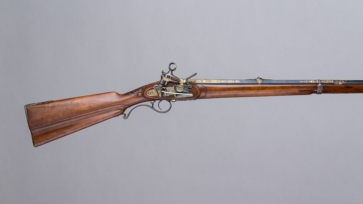 This miquelet sporting gun was made for the Prince Regent of Portugal, John/João VI (1767–1826), who reigned from 1816 to 1826 as King of Portugal and Algarve and from 1816 to 1822 as King of the United Kingdom of Portugal, Brazil, and Algarve. Made in 1802 by Jacintho Xavier, master of the Royal Military Arsenal in Lisbon from 1794 to 1808 and therefore Portugal’s leading gunmaker, it was intended as one of the Regent’s personal hunting arms. The superb gold-inlaid decoration of the metal parts, contrasted by the blued steel ground, attest to the care and luxury of manufacture, while the presence of the Portuguese arms on the stock and trigger guard confirm the royal ownership.