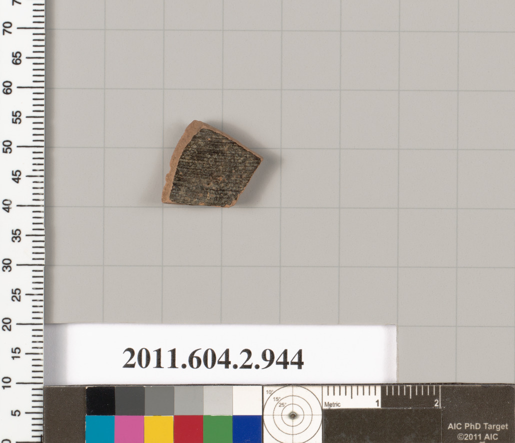 Head, neck, right shoulder, bent right arm, and hand of a male to left, wearing an apicate fillet