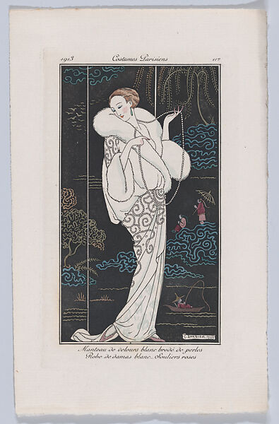 Illustration with a design for a white damask gown embroidered with pearls and a white velvet coat, part of the 50th issue of the "Journal des dames et des modes", published in Paris on October 10, 1913. The illustration features a woman wearing a long, white gown with a long, narrow skirt with train and featuring a scrolling pattern created with embroidered pearls, under a white velvet coat with fur on the sleeves and neck. She wears a long pearl necklace, long, blue earrings, and pink, pointed shoes. Her light brown hair is tied back, and her face is made up with light blue eyeshadows, pink blush, and pink rouge. Behind her is an Oriental landscape pattern with trees, water, boats, men and women, executed with blue, green, brown, and purple over a black ground.