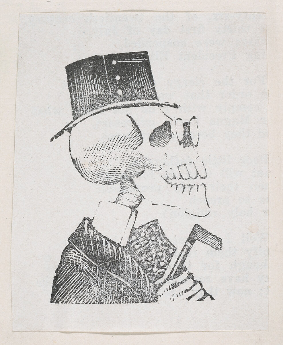 - Title: A profile of a skeleton with a tophat, a coat, and glasses, from a broaside entitled 'La Calavera de Cupido', published by Antonio Vanegas Arroyo.