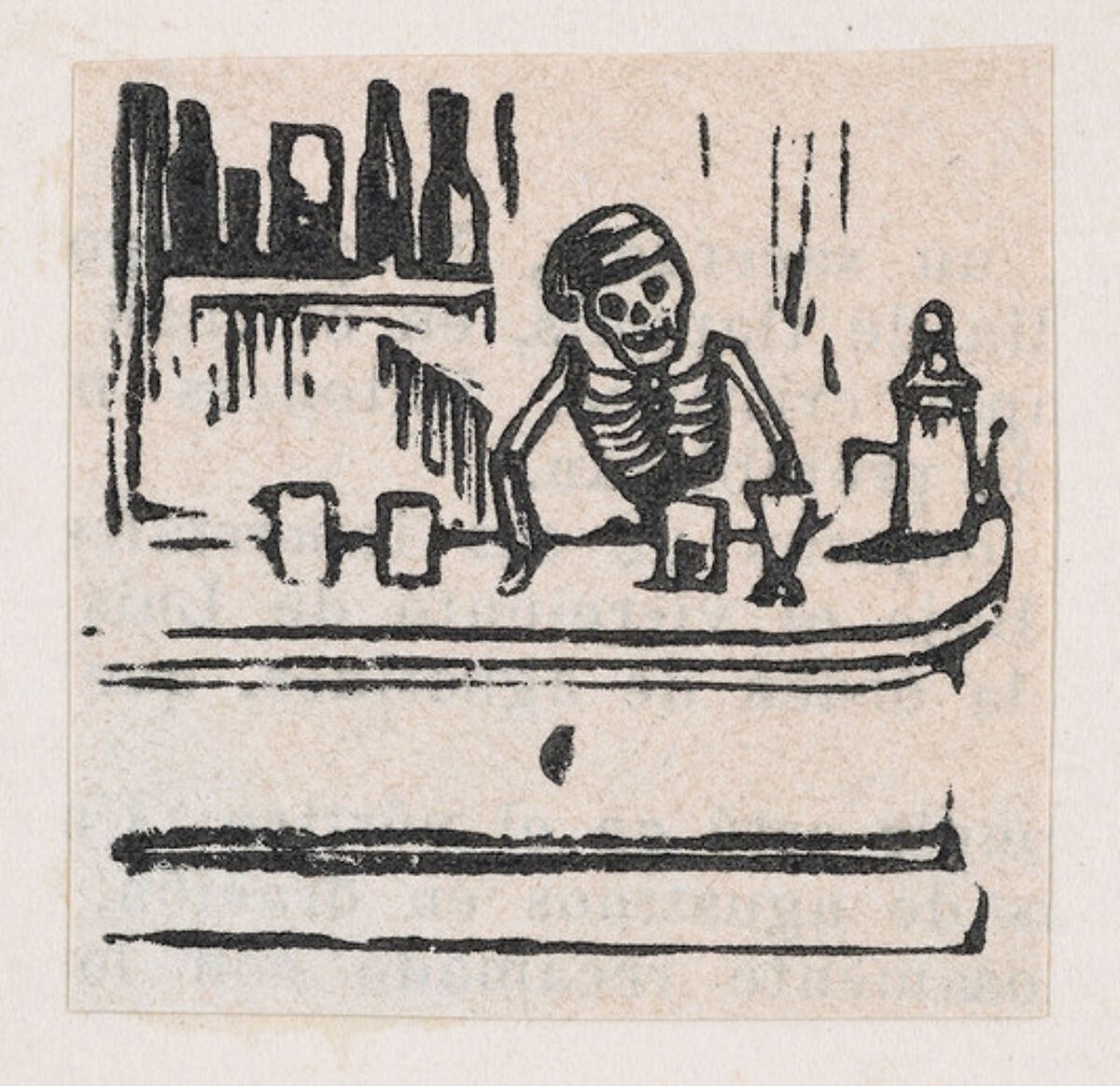 A skeleton serving alcohol, from a broadside enitled 'Medicinas de Patente de mas Fama'