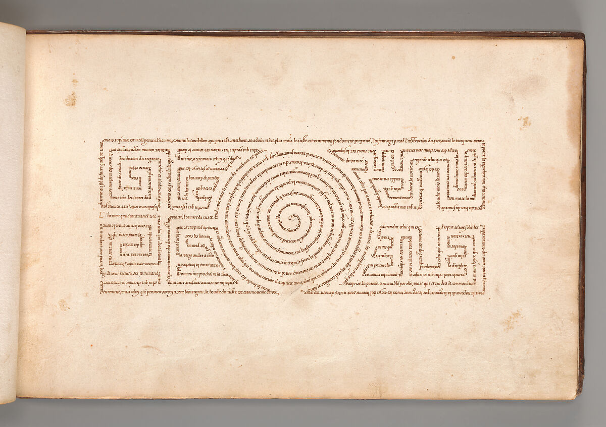Micrographic design in the shape of a labyrinth. The text of the micrographic design is written in cursive French and starts with the words 'L'homme prudent (...)'. The initial L is written in gold, while the rest of the text is executed in brown ink. Part of an album of 26 examples of calligraphy and micrography, thought to have been produced in France or possibly Antwerp at the beginning of the seventeenth century.