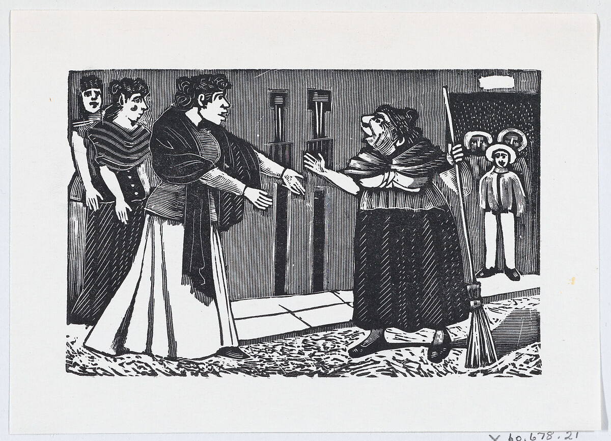 - Title: An old woman with a broom in her hand arguing with a younger woman from a broadside entitled 'El Pleito de Vecindad'