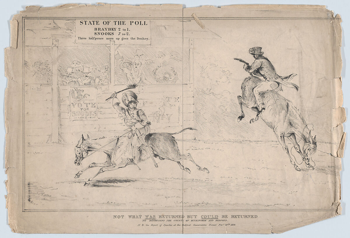 This political satire comments on Conservative party politics in a November 1838 election at Bedford, an English county town. Two rival candidates ride donkeys in a ring, one in military uniform holding a brush, the other dressed as a country gentleman, mounted backwards and grasping his mount's tail. Stands behind the riders are filled with spectators, and a poster gives their names--Brabey and Snooks--as well as their standings.