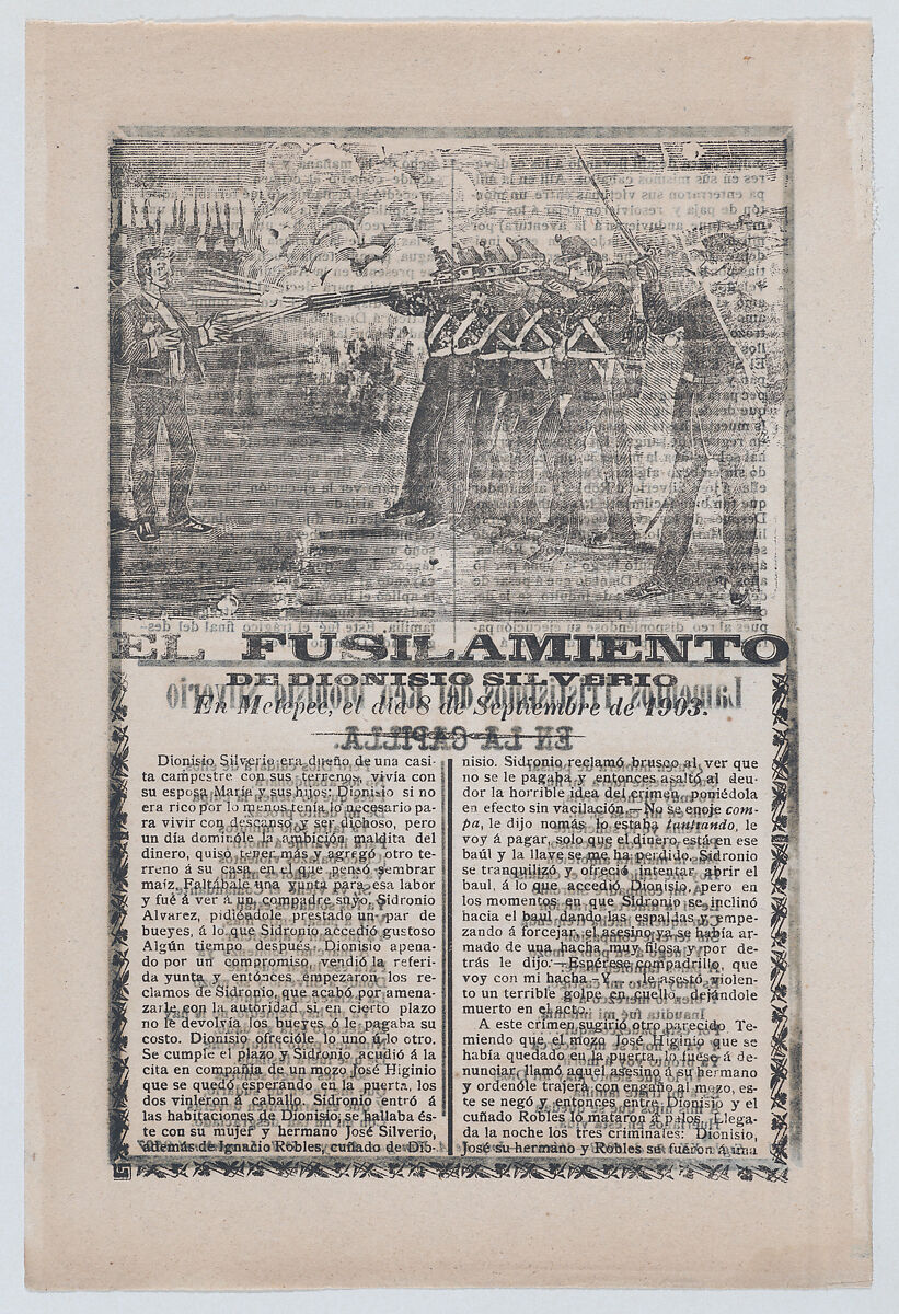- Title: Broadsheet relating to the execution of a murderer named Dionisio Silverio, a firing squad in the upper section