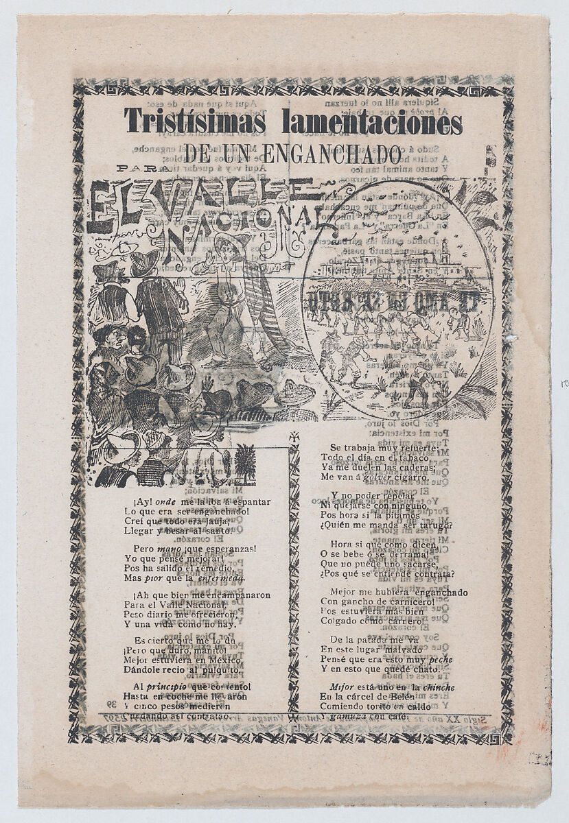 - Title: Broadsheet relating to people being tricked into working in tobacco fields, a man warning a crowd about harsh labor conditions