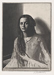 The title identifies the sitter as a woman of mixed European and African parentage, either from the Caribbean or Louisiana. In this final state, the face, upper body and cascading hair are highly finished, but the left hand and long cuffs left undeveloped. The artist showed a related painting at the Royal Academy and Royal Society of Painter-Etchers and Engravers in 1930 (also see 56.58 for a painting in the Museum's collection of the same sitter).