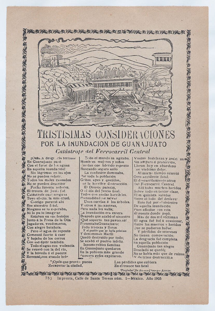 - Title: Broadsheet relating to a news story about the destruction following a flood in Guanajuato, a collapsed bridge and train car with victims